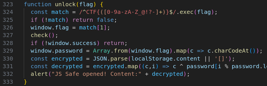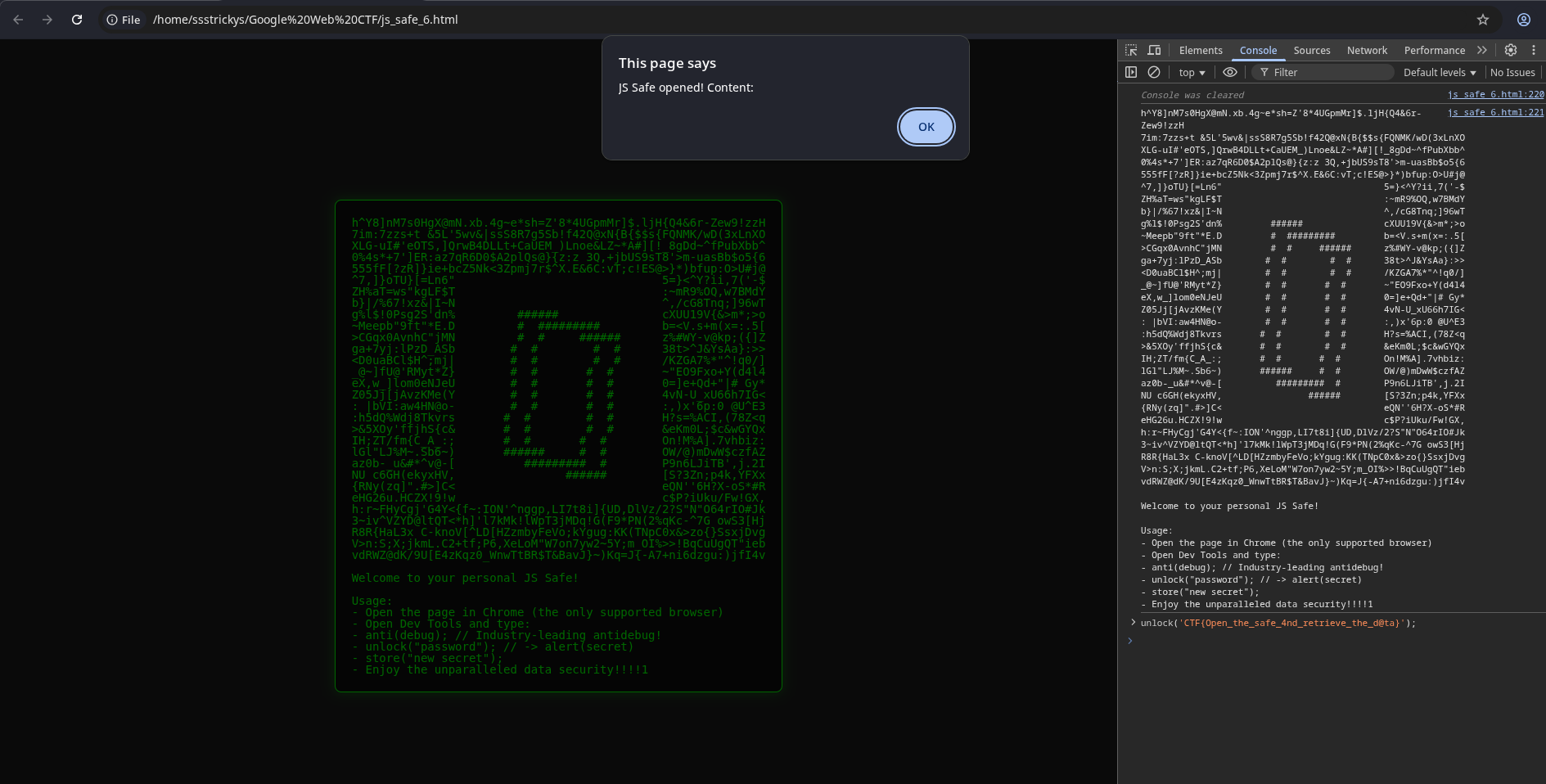 Challenge description: You stumbled upon someone’s “JS Safe” on the web. It’s a simple HTML file that can store secrets in the browser’s localStorage. This means that you won’t be able to extract any secret from it (the secrets are on the computer of the owner), but it looks like it was hand-crafted to work only with the password of the owner. Another year, another JS Safe challenge! I’m always looking forward to this challenge during Google CTF.