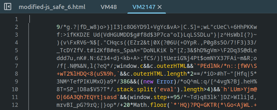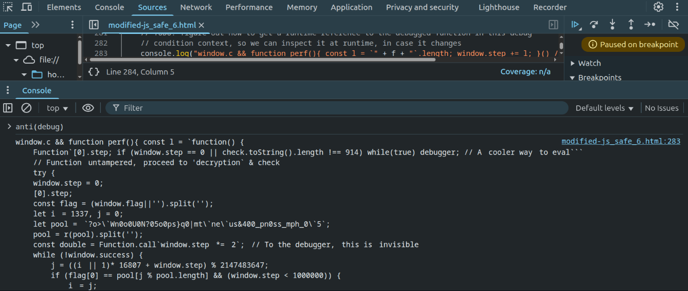 When initially calling anti(…) we pass the variable debug [1], which ends up inside instrument() that checks two conditions: document.documentElement.outerHTML.length !== 14347 This is fairly easy to bypass, whenever I change the source file I need to update the “total document length”.