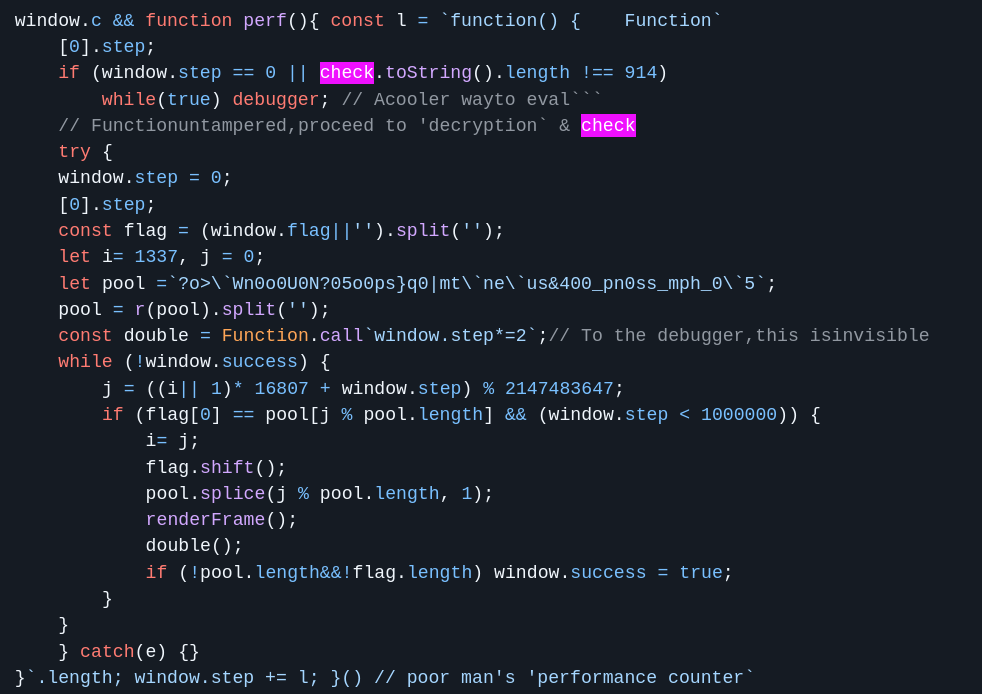 Now we’re comfortable modifying the check() code and patching out check.toString().length !== 914 anti-debug trick.